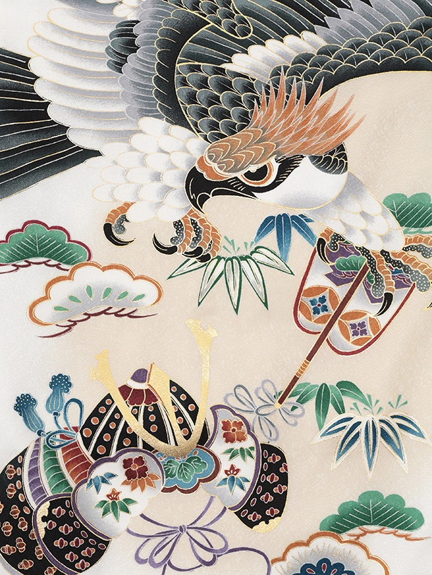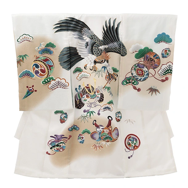 男児産着 お宮参りレンタルR046 【正絹】白地 鷹 兜 鼓