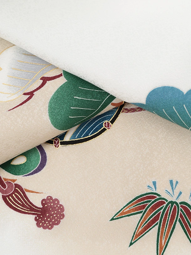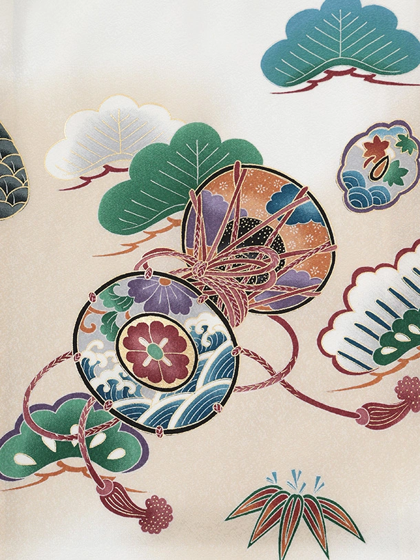 お祝い着をかける時は 絵柄がよく見える様に広げ抱いた子供の体を覆う様に掛け産着の付紐の一方を肩側から他方を脇から通して 抱き手の方の背で蝶結びにします。