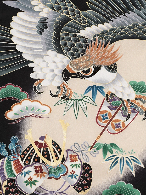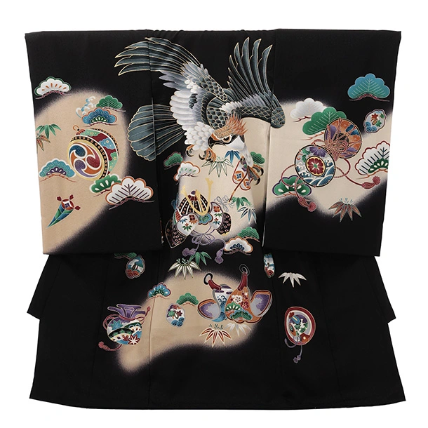 男児産着 お宮参りレンタルR047 【正絹】黒地 鷹 兜 鼓