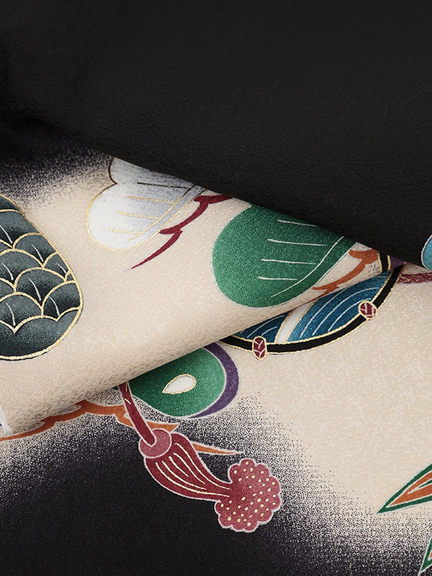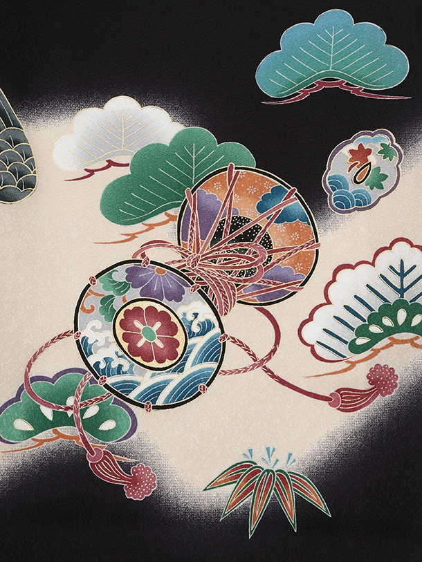 お祝い着をかける時は 絵柄がよく見える様に広げ抱いた子供の体を覆う様に掛け産着の付紐の一方を肩側から他方を脇から通して 抱き手の方の背で蝶結びにします。