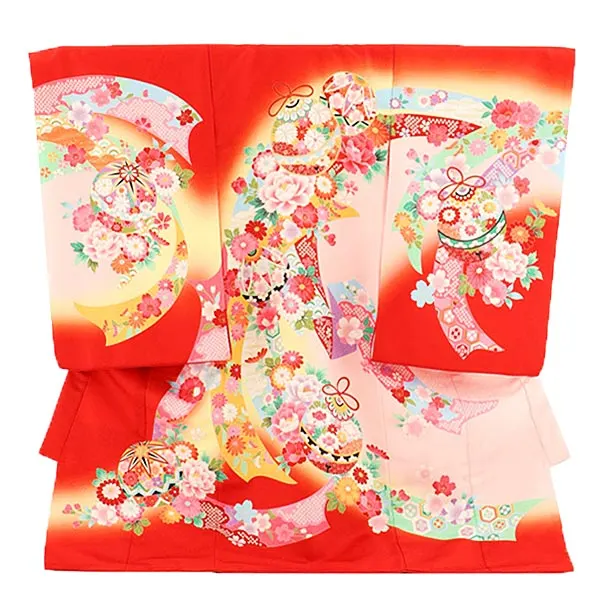 赤地に、蝶と御所車が描かれたお着物です。上品に描かれた柄は、格調高く、落ち着いた雰囲気です。正統派な装いとして、お子様の健やかなる成長を願う日にふさわしい一枚です。