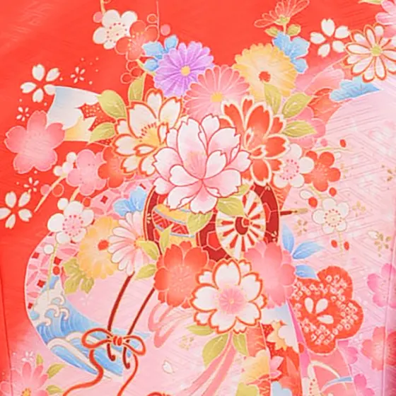 赤地に、花車が描かれたお着物です。牡丹を載せた花車に、熨斗(のし)や、華やかな花々が彩りを添えます。神社へのお宮参りや記念撮影におすすめです。
