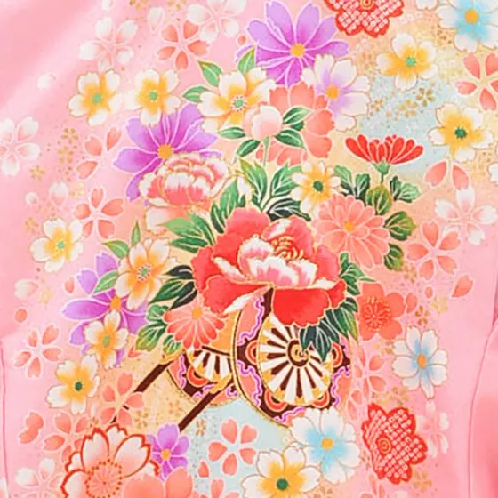 ピンク地に、花車が描かれたお着物です。牡丹を載せた花車に、華やかな花々が彩りを添えます。神社へのお宮参りや記念撮影におすすめです。