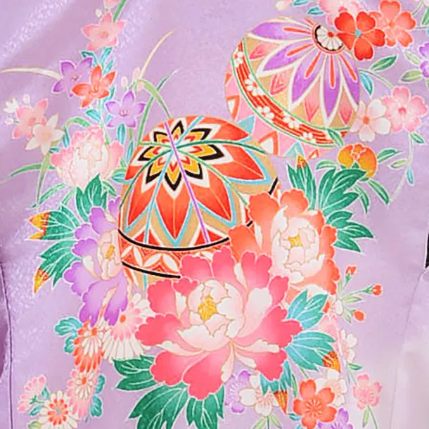 パープルに、鞠(まり)や牡丹などが描かれたお着物です。扇や御所車などの古典柄も美しく、華やかさの中にも上品さを併せ持った一枚です。お子様の健やかなる成長を願う日にふさわしいお柄です。