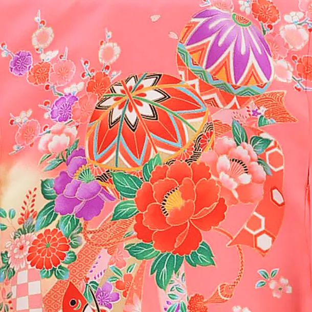 濃ピンクに、鞠(まり)や蝶などが描かれたお着物です。鼓(つづみ)や御所車などの古典柄も美しく、華やかさの中にも上品さを併せ持った一枚です。お子様の健やかなる成長を願う日にふさわしいお柄です。