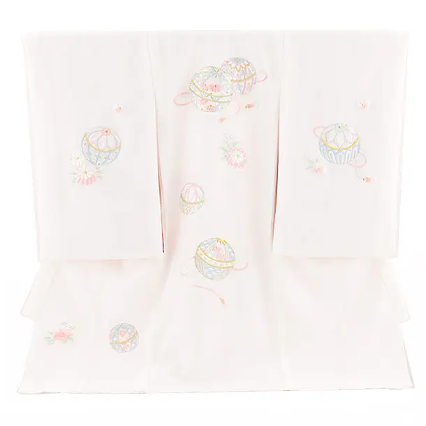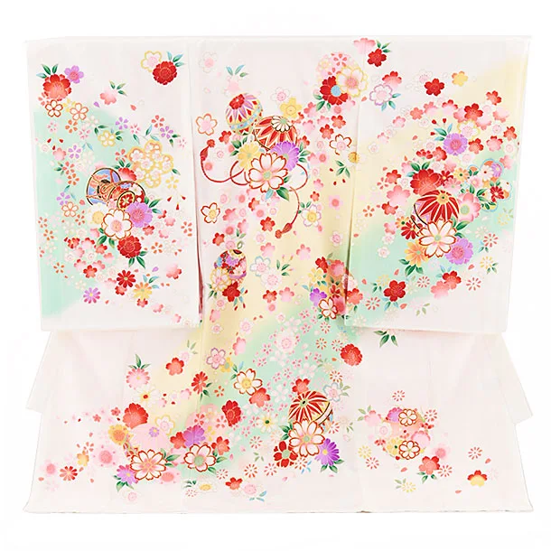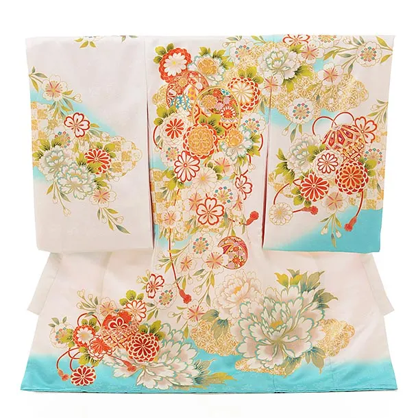 白地に、牡丹が描かれたお着物です。紫などシックな色合いを基調としながら、華やかなデザインが豪華さを引き立てます。お子様の健やかなる成長を願う日にふさわしいお柄です。