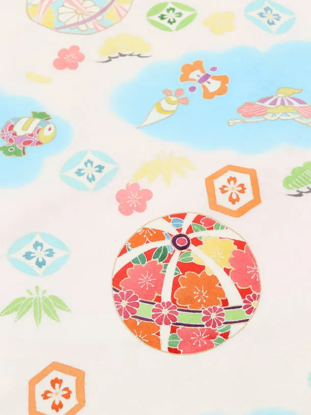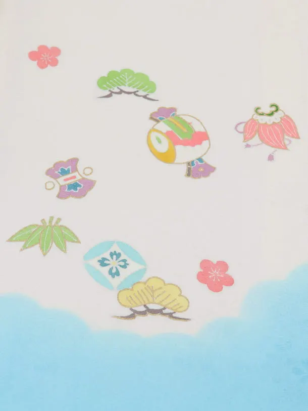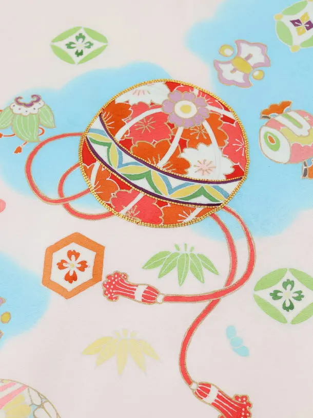 「白地い水色の雲取り暈かし」という大変珍しい商品で、鞠と宝尽しをあしらったおめでたい柄が施されております。