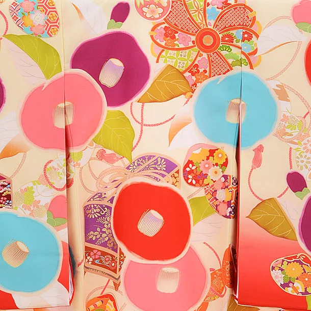 クリーム地に、丸椿が描かれたお着物です。鮮やかな色使いで描かれた丸椿が華やかで豪華な雰囲気です。現代的なデザインの中にも、文箱や貝合わせなどの古典柄が上品で正統派な印象も添えます。神社へのお宮参りや記念撮影におすすめです。