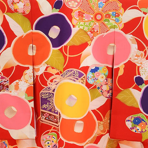 赤地に、丸椿が描かれたお着物です。鮮やかな色使いで描かれた丸椿が華やかで豪華な雰囲気です。現代的なデザインの中にも、文箱や貝合わせなどの古典柄が上品で正統派な印象も添えます。神社へのお宮参りや記念撮影におすすめです。