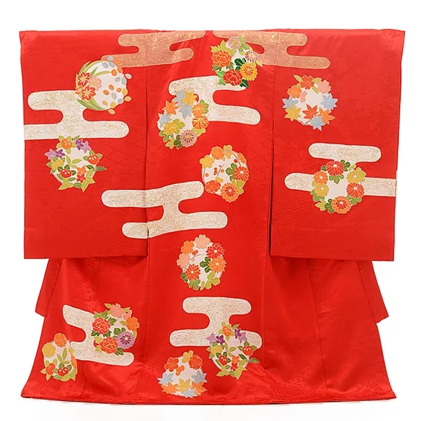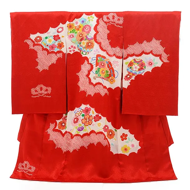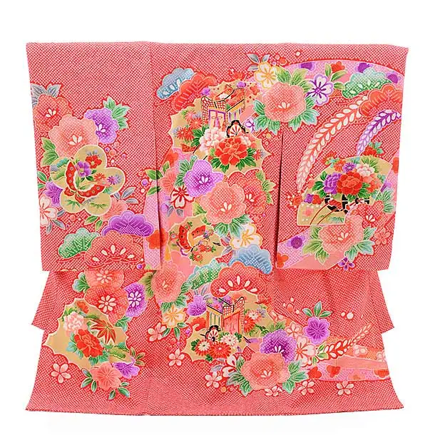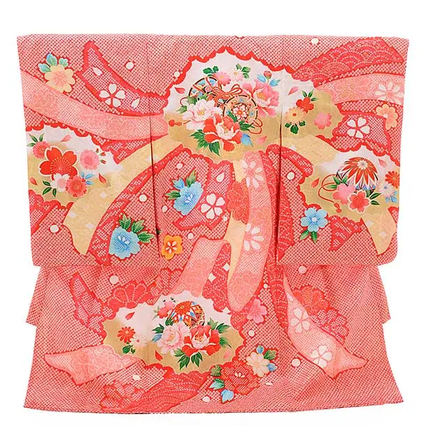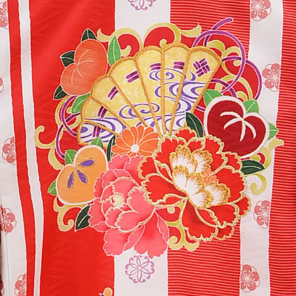 赤地に、扇や牡丹などが描かれたお着物です。ストライプ柄がモダンでレトロな雰囲気です。鮮やかな色使いが華やかな雰囲気をより一層引き立てます。お子様の健やかなる成長を願う日にふさわしい一枚です。