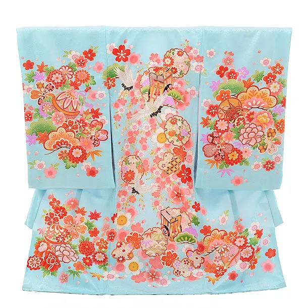 水色に、鞠(まり)、花々などが描かれたお着物です。