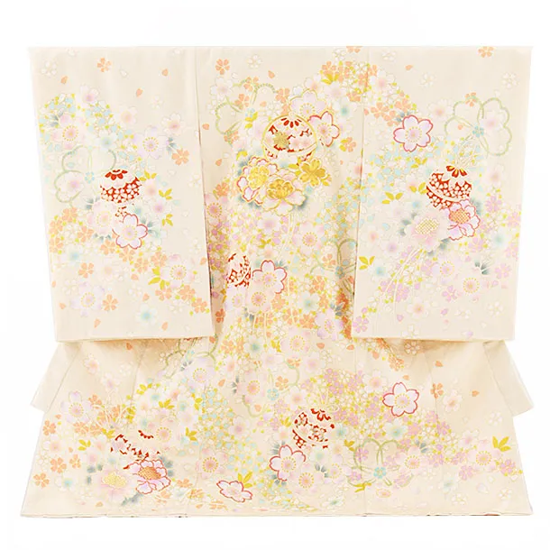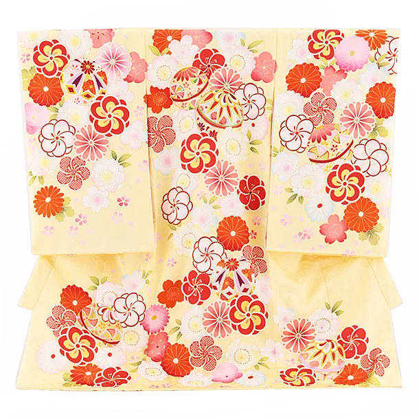 黄色に、鞠(まり)が描かれたお着物です。優しい色使いが上品で愛らしい雰囲気です。鼓や鈴、花紋といった古典柄が、お子様の健やかなる成長を願う晴れの日にふさわしい一枚です。