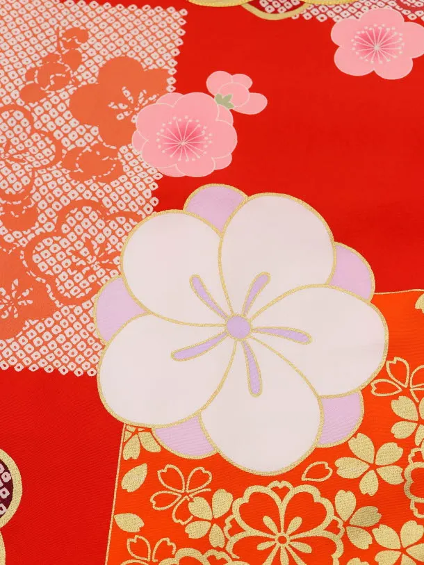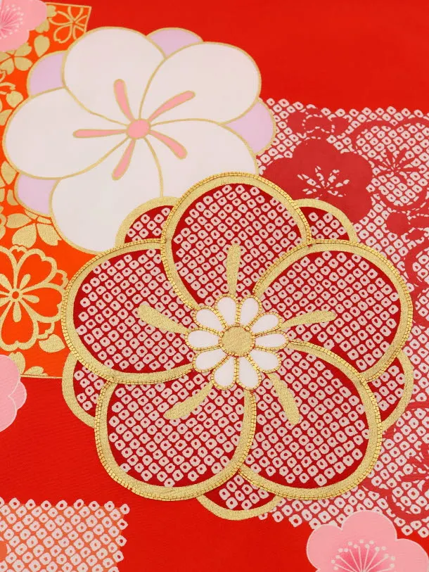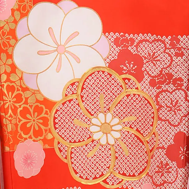 赤地に、ひねり梅が描かれたお着物です。大きく描かれた梅がレトロでモダンな雰囲気です。正統派の赤に、大胆な柄が映え、お宮参りや記念撮影にもオススメの一枚です。