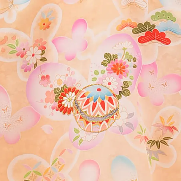 淡いオレンジに、鞠(まり)が描かれたお着物です。優しい色使いに上品な古典柄が可愛らしい印象です。またシルエットで描かれた蝶が華やかさを引き立てます。