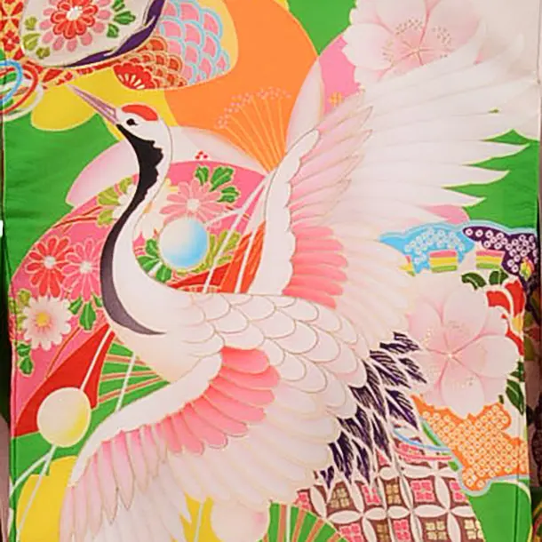 緑地に、鶴や伝統的な古典柄が描かれたお着物です。大きく描かれた鶴と鮮やかな色使いの扇や桜の柄が豪華で華やかな印象です。華やかで縁起の良い柄は、神社へのお宮参りや記念撮影におすすめです。
