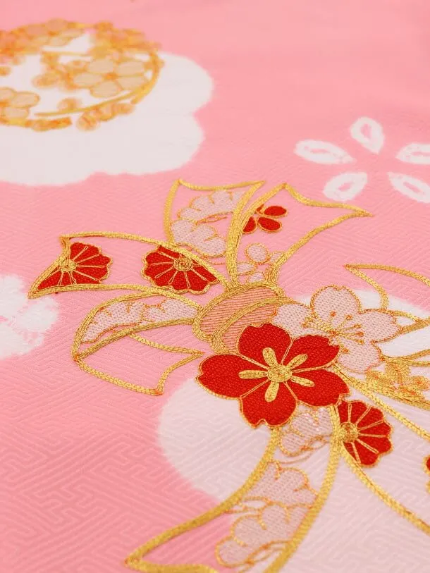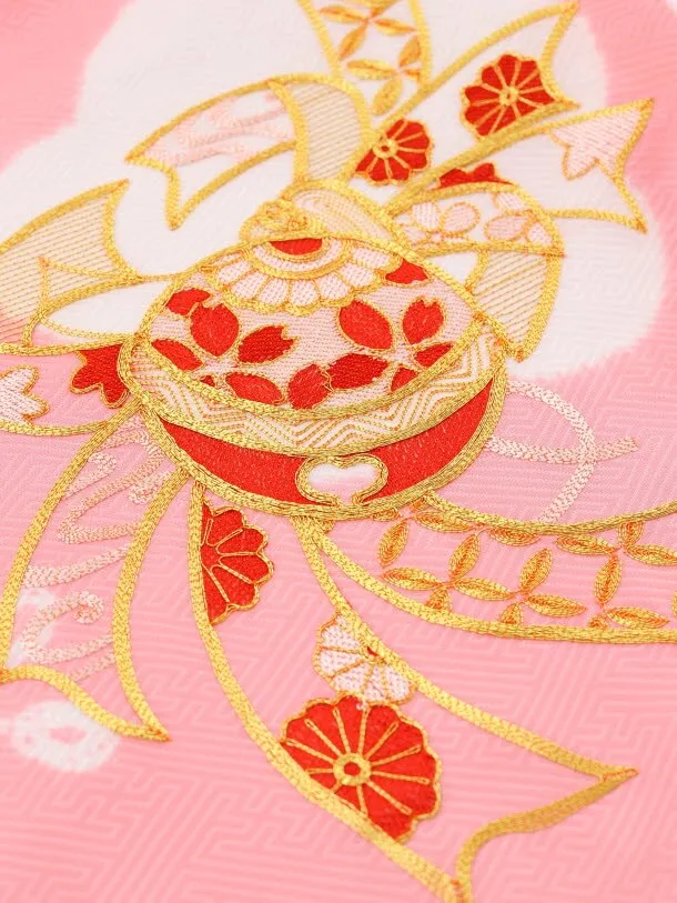 ピンク地に、梅、熨斗(のし)、鈴が描かれたお着物です。熨斗(のし)、鈴、花の丸紋には金糸で繊細な刺繍が施されており、華やかな雰囲気です。絞りで描かれた花柄は上品で愛らしい印象を添えます。