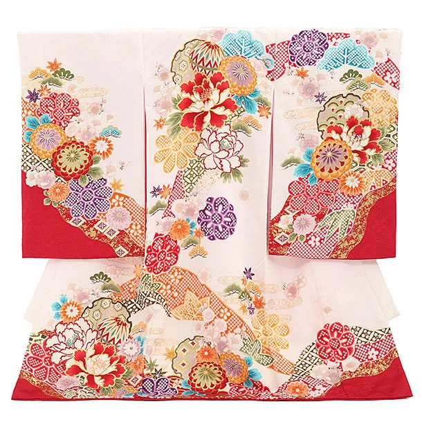 白地に、色鮮やかな花柄が描かれたお着物です。大輪の花々が全体を彩り、美しく豪華な印象です。裾のオレンジがアクセントとなり、華やかな雰囲気をより一層引き立てます。