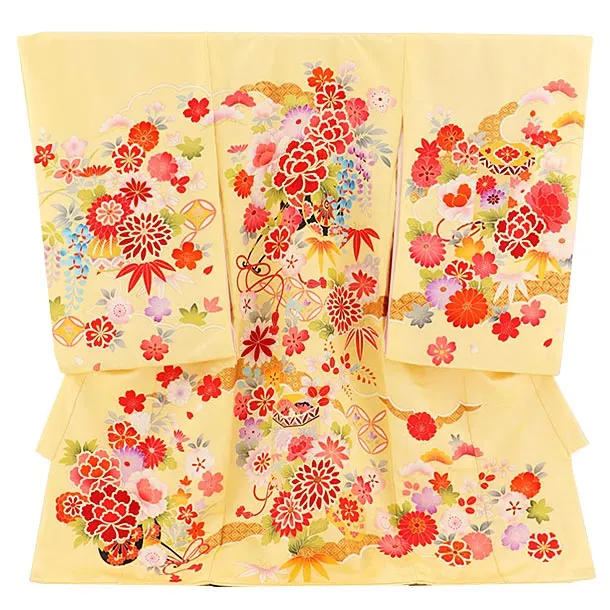淡い黄色地に、鼓(つづみ)と鶴が描かれたお着物です。優しい色合いに華やかに描かれた古典柄が美しく洗練された印象です。神社へのお宮参りや記念撮影におすすめです。