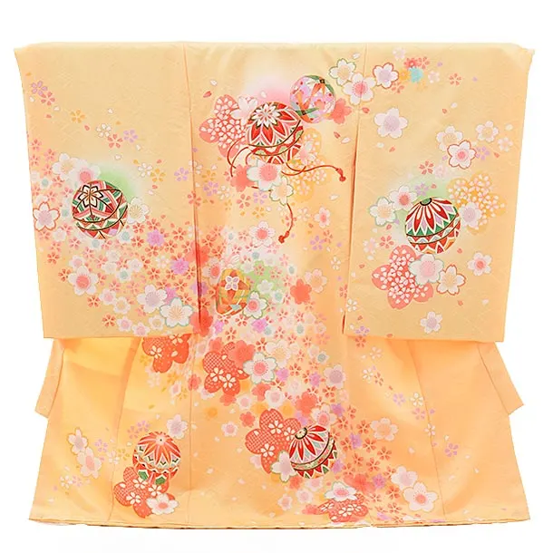 白地に、牡丹と貝桶が描かれたお着物です。爽やかな白地に華やかに描かれた縁起柄が、おめでたい豪華な雰囲気です。お子様の健やかなる成長を願う日にふさわしい一枚です。