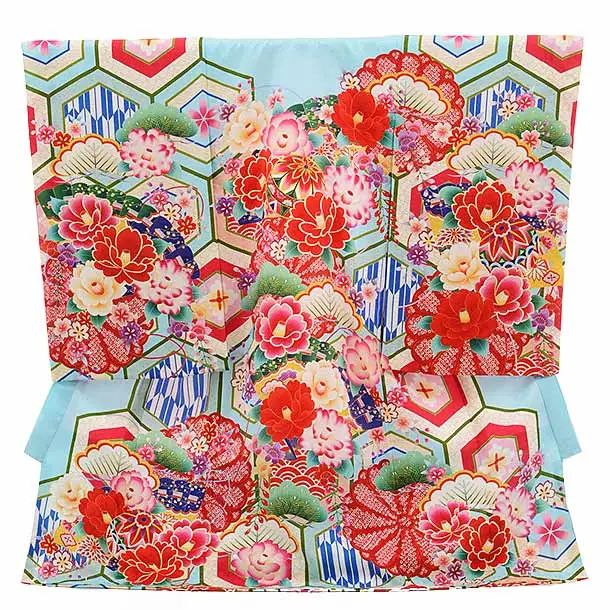水色地に、うさぎと花車が描かれたお着物です。牡丹など色鮮やかな花々を乗せた花車が豪華な雰囲気です。縁起の良い松竹梅や愛らしいうさぎなどが、おめでたい華やかな印象を添えます。