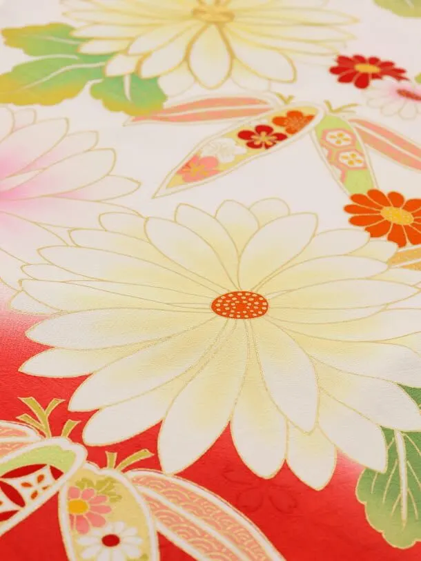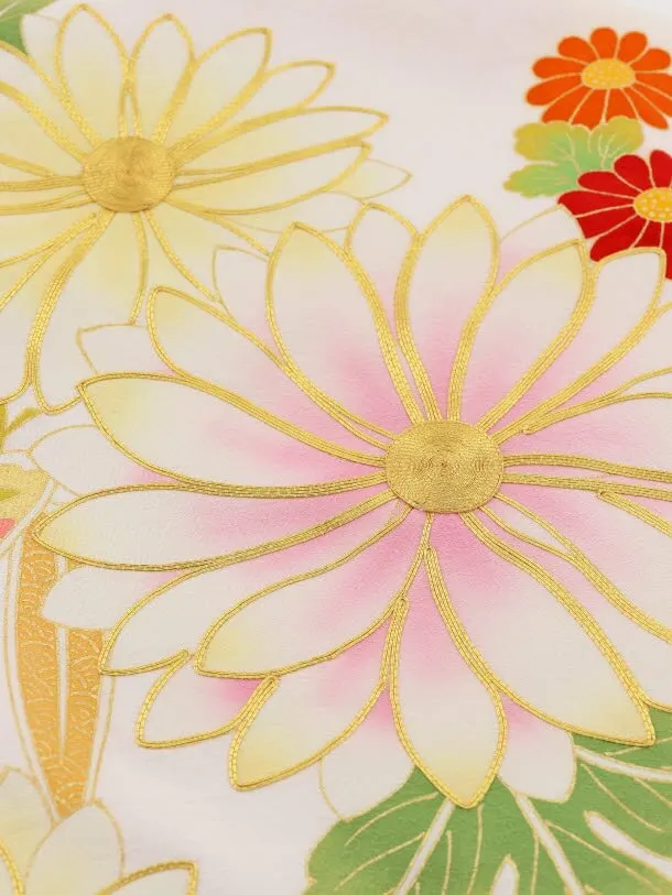 白地に、菊が描かれたお着物です。大胆に描かれた大輪の菊が豪華な雰囲気です。赤のぼかしがアクセントとなり、華やかさをより一層引き立てます。
