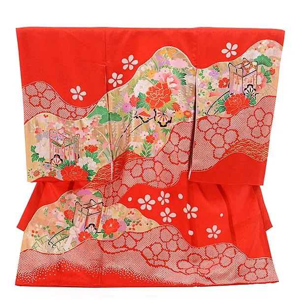 赤地に、扇、鞠(まり)、牡丹などの花柄が描かれたお着物です。扇や鞠(まり)などの古典柄と周りを彩る色鮮やかな花々が華やかな雰囲気です。袖に描かれた流水柄が優雅な印象を添えます。