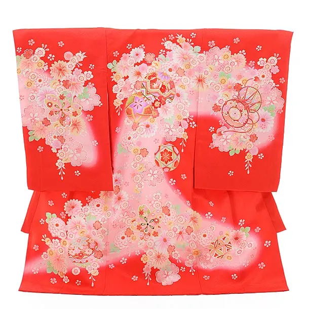 赤地に、桜と鞠(まり)が描かれたお着物です。華やかな赤と古典柄が美しく、正統派な雰囲気です。お子様の健やかなる成長を願う日にふさわしいお柄です。