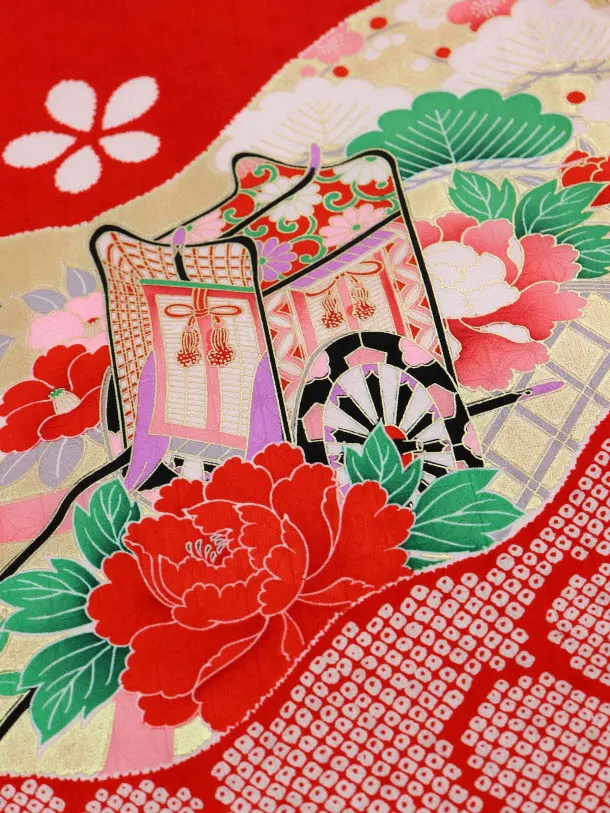 赤地に、牡丹、花車が描かれたお着物です。絞り柄であしらわれた花の文様が伝統的ながら可愛らしい雰囲気を添えます。神社へのお宮参りや記念撮影におすすめです。