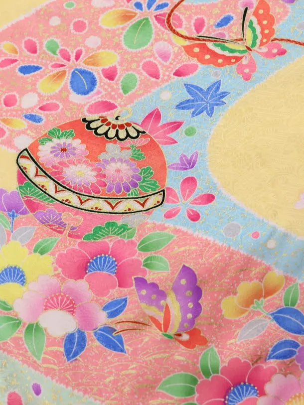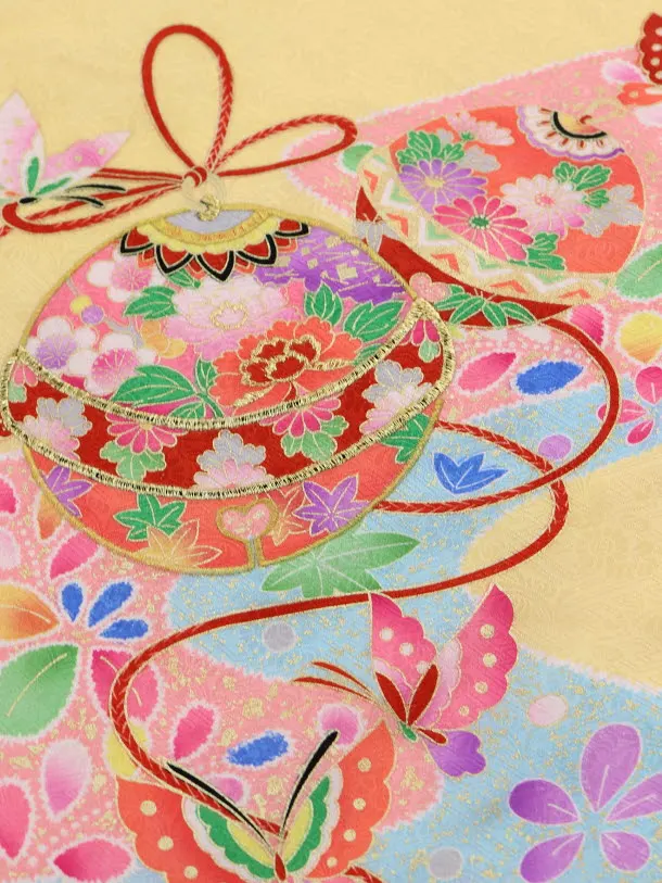 黄色に、鈴が描かれたお着物です。愛らしい鈴と周りを彩る蝶や花々が華やかな印象です。優しい色使いが上品で愛らしい雰囲気を引き立てます。神社へのお宮参りや記念撮影におすすめです。