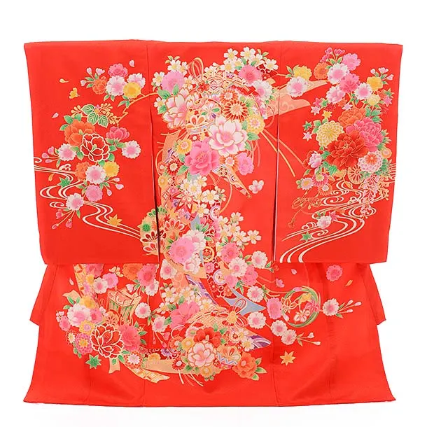 女児産着 お宮参り レンタル 正絹 1393 赤地 鈴