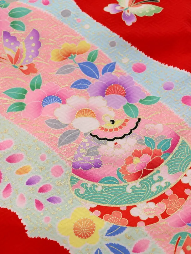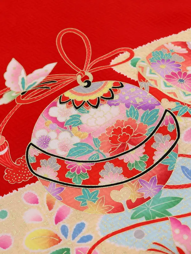 赤地に、鈴が描かれたお着物です。愛らしい鈴と周りを彩る蝶や花々が華やかな印象です。明るい赤と淡い色合いのコントラストも新鮮な雰囲気です。神社へのお宮参りや記念撮影におすすめです。