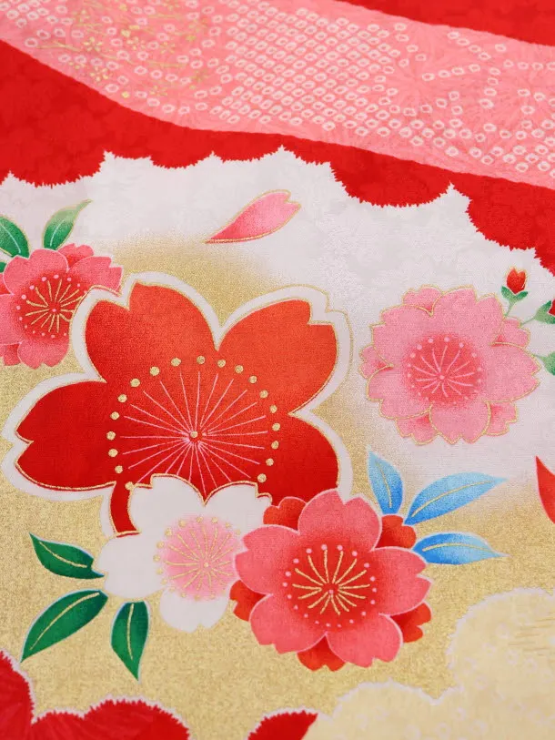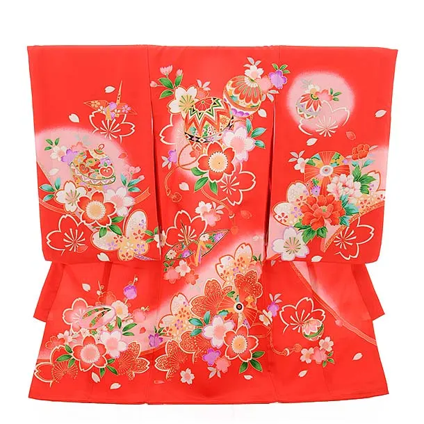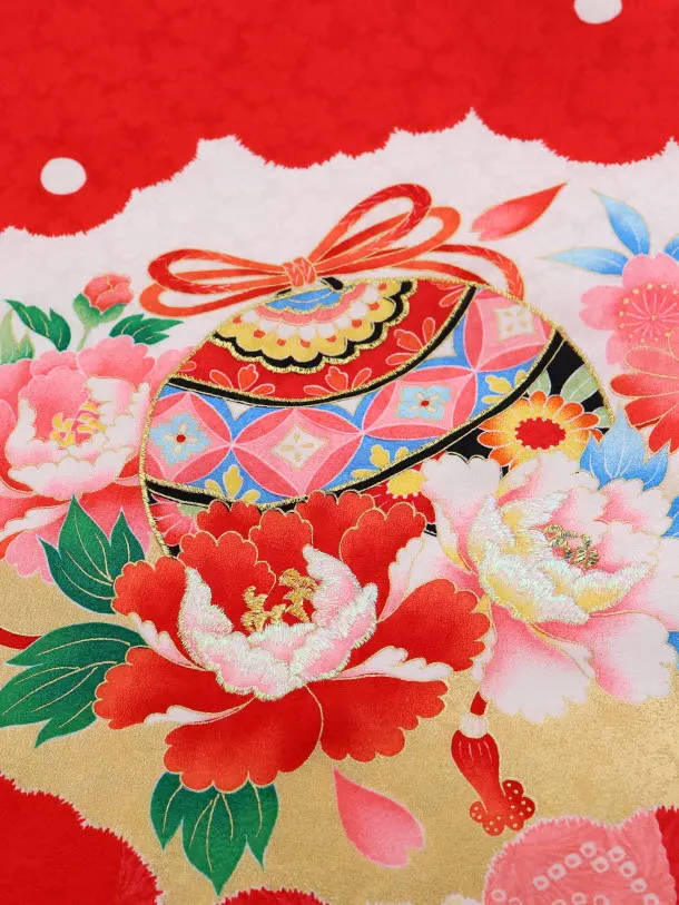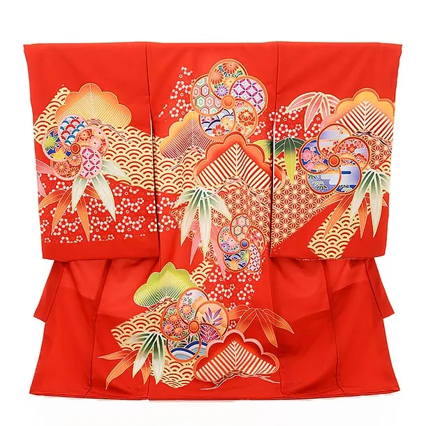 赤地に、熨斗(のし)、牡丹、鈴などが描かれたお着物です。伝統的な古典柄は正統派の装いとして、お子様の健やかなる成長を願う日にふさわしいお柄です。
