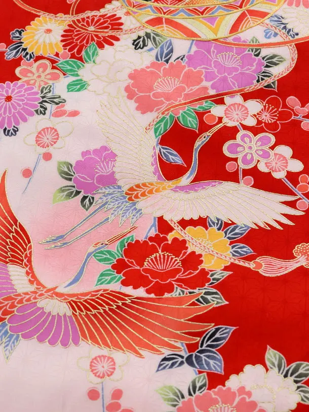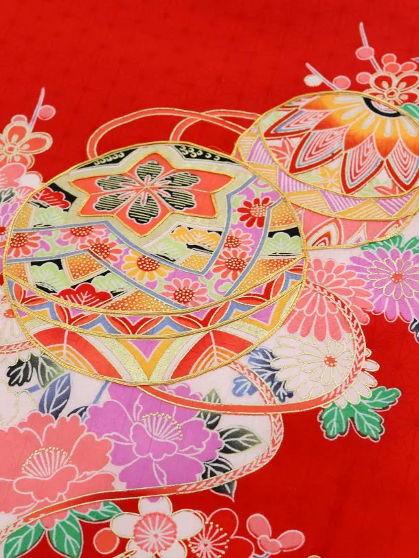 赤地に、鞠(まり)と鶴が描かれたお着物です。古典的な鞠(まり)と舞うように描かれた鶴が優雅な雰囲気です。鮮やかな色使いが華やかでおめでたい印象を引き立てます。お宮参りや写真撮影にもおすすめの一枚です。