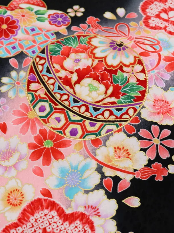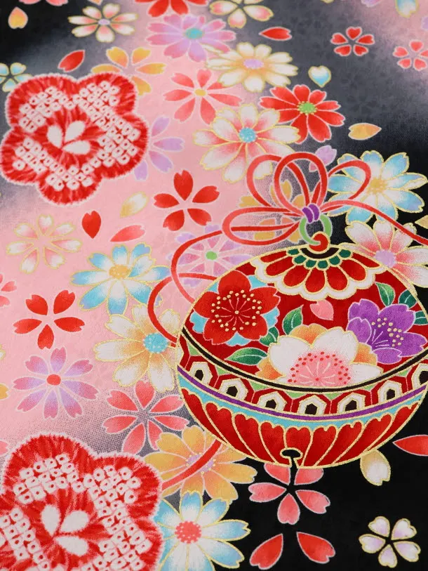 黒地に、鞠(まり)や鈴、小花が描かれたお着物です。丸くふっくらとした可愛らしい鞠(まり)や鈴の形と、その周りを彩る小花が女の子らしく愛らしいデザインです。黒地に明るい色使いが映え、お宮参りや写真撮影にもおすすめです。