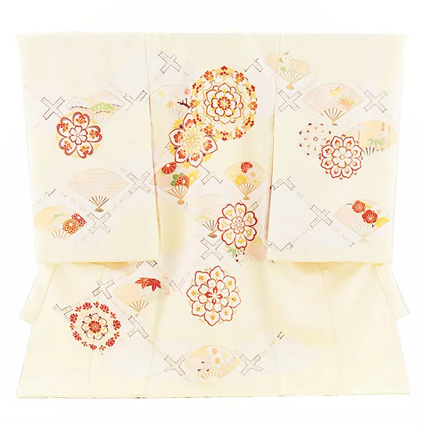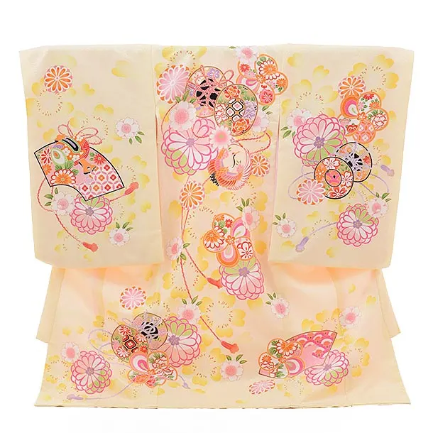 女児産着 お宮参り レンタル 正絹 1434 うす黄色地 花にまり