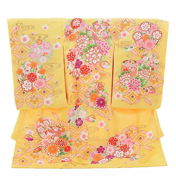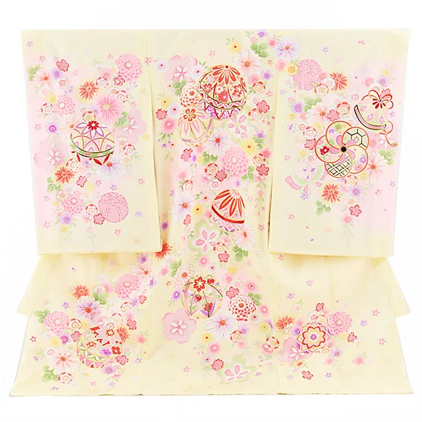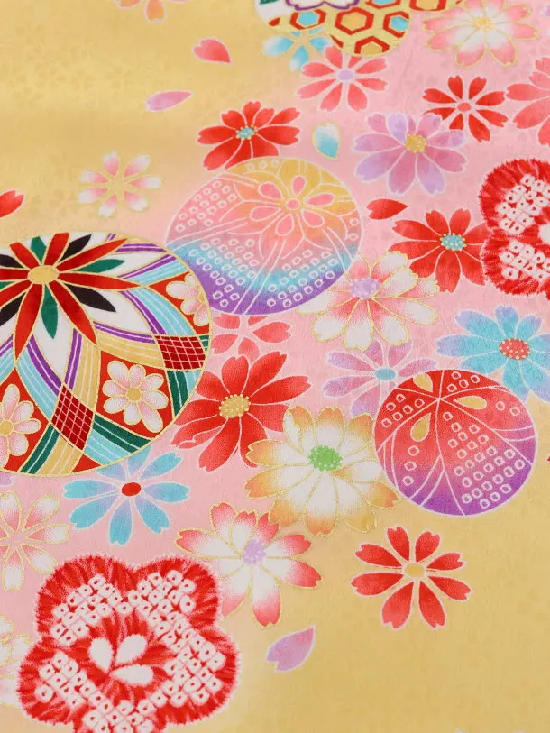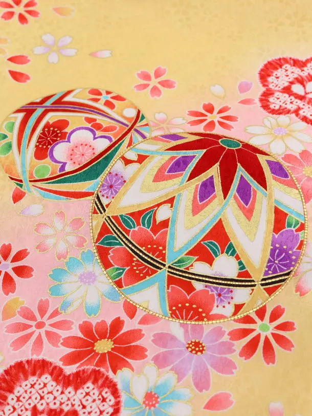 黄色地に、鞠(まり)と小花が描かれたお着物です。丸くふっくらとした可愛らしい鞠(まり)の形と、その周りを彩る小花が女の子らしく愛らしいデザインです。