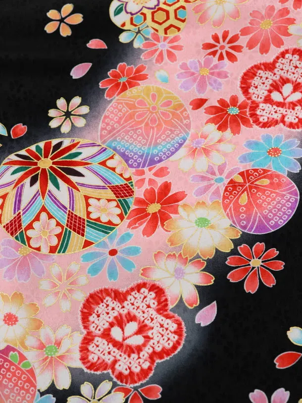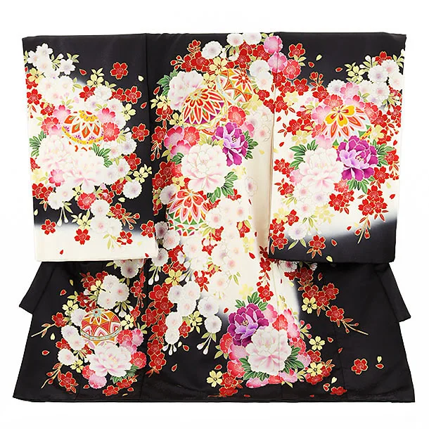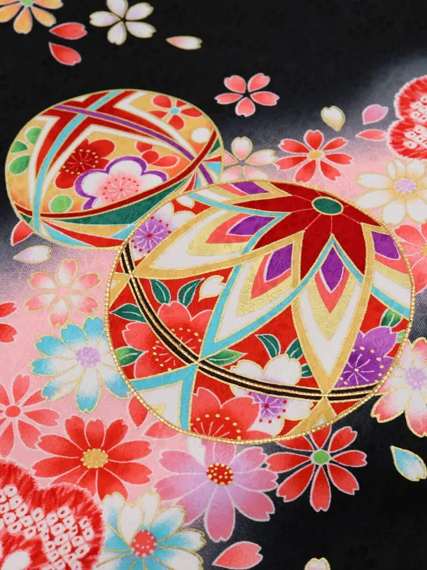 黒地に、鞠(まり)と小花が描かれたお着物です。丸くふっくらとした可愛らしい鞠(まり)の形と、その周りを彩る小花が女の子らしく愛らしいデザインです。黒地に明るい色使いが映え、お宮参りや写真撮影にもおすすめです。