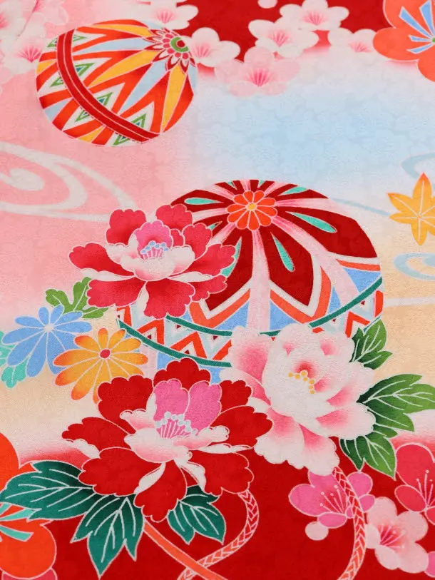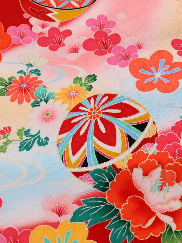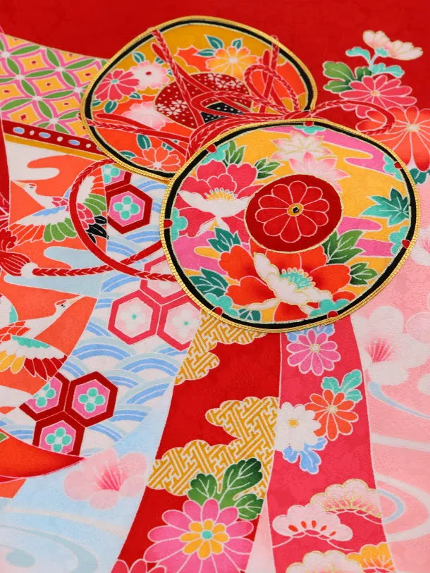 赤地に、鼓(つづみ)、熨斗(のし)、鞠(まり)などが描かれたお着物です。明るい赤色と鮮やかに描かれた古典柄が華やかな雰囲気です。