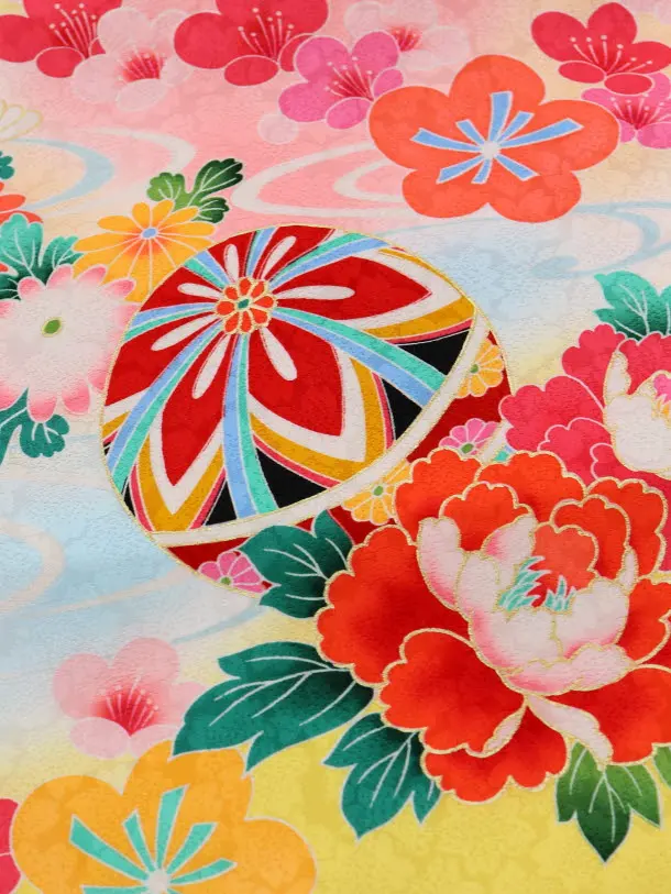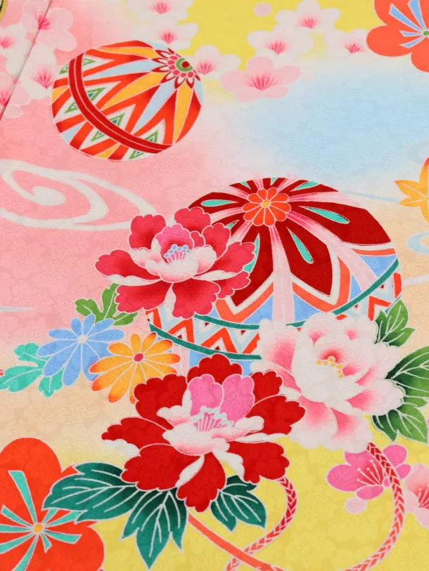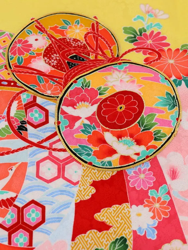 黄色地に、鼓(つづみ)、熨斗(のし)、鞠(まり)などが描かれたお着物です。明るい黄色と鮮やかに描かれた古典柄が華やかな雰囲気です。