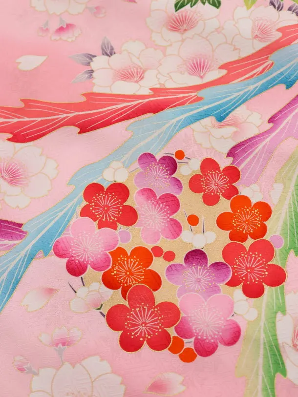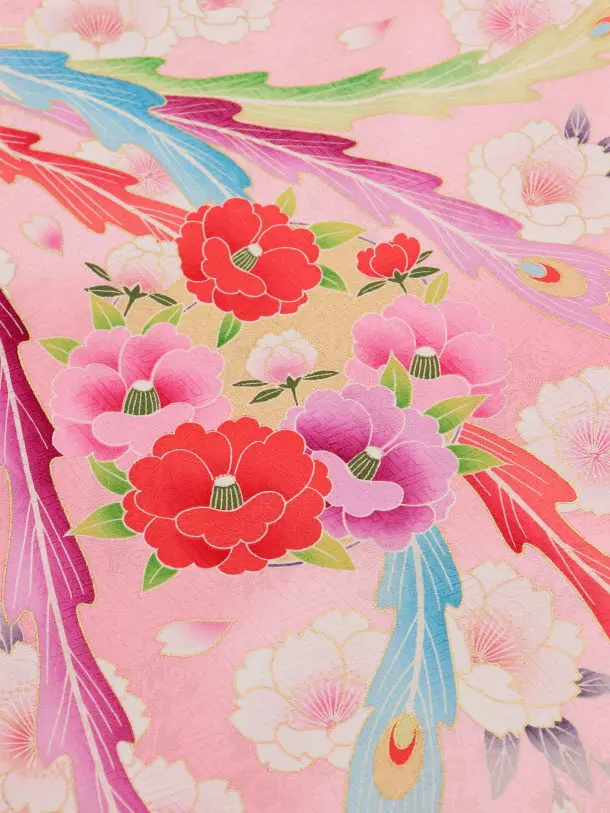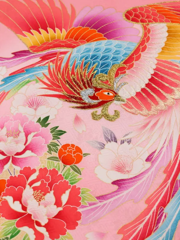 ピンク地に、牡丹と鳳凰が描かれたお着物です。中央に舞う色鮮やかな鳳凰と、牡丹などの花々が大変豪華で華やかな雰囲気です。