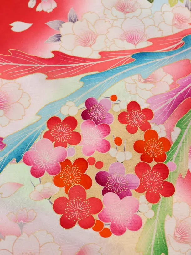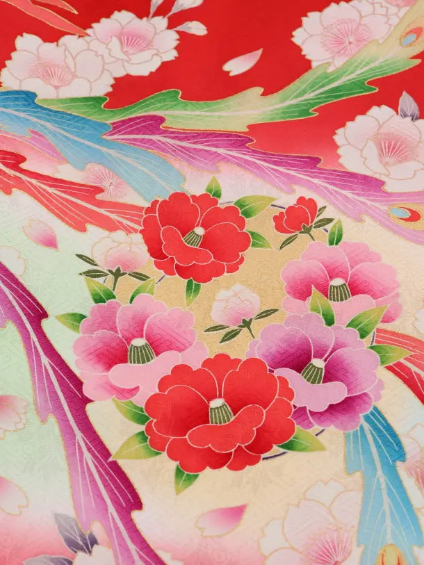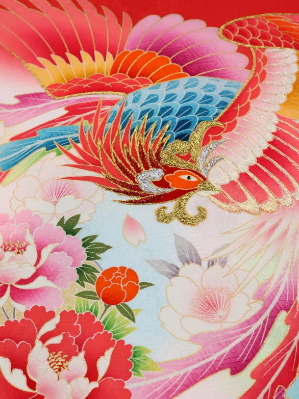 赤地に、牡丹と鳳凰が描かれたお着物です。中央に舞う色鮮やかな鳳凰と、牡丹などの花々が大変豪華で華やかな雰囲気です。
