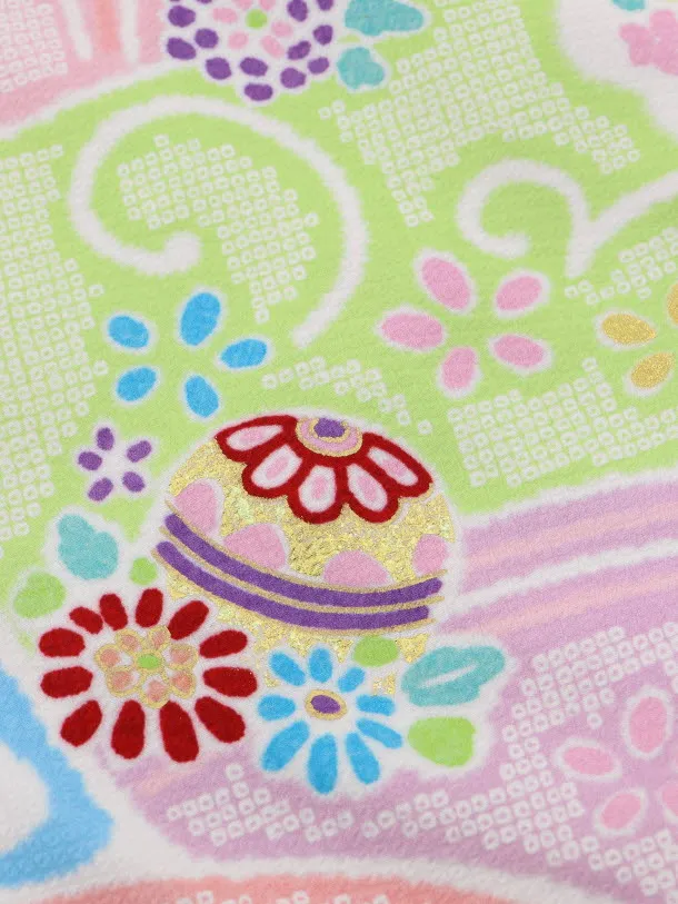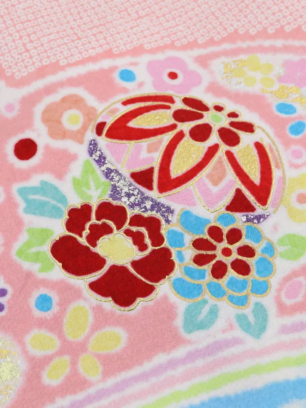 ピンク地に、鞠(まり)や花が描かれたお着物です。優しい色使いが女の子らしく上品な雰囲気です。絞り柄で描かれた山取模様が華やかな印象も添えます。