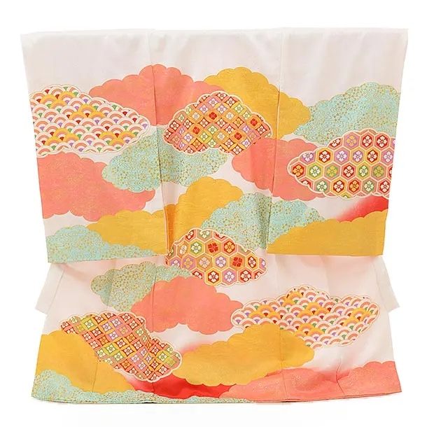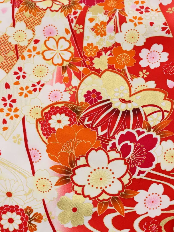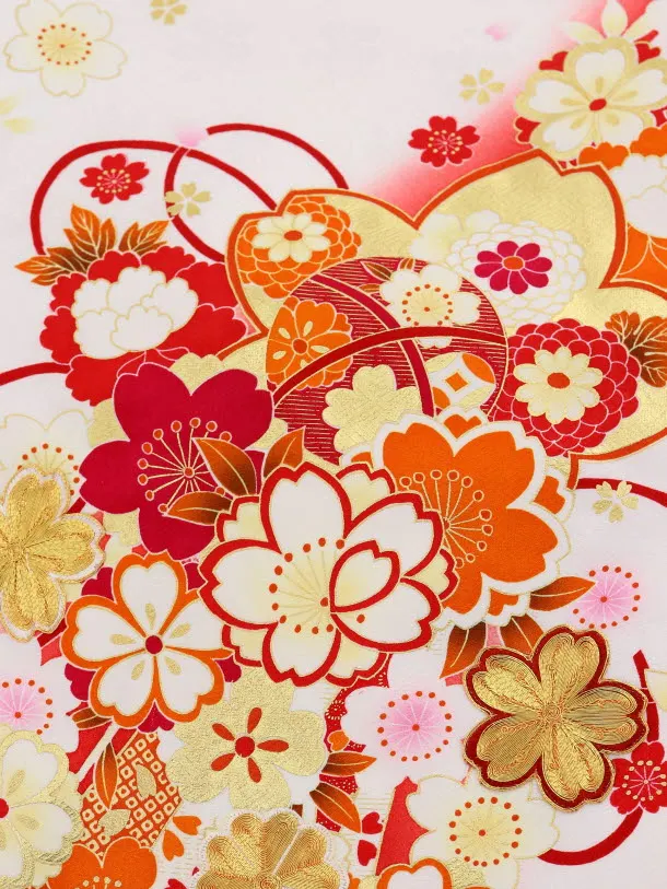 白地に、鞠(まり)や桜などの花柄が描かれたお着物です。ふんだんに描かれた花々が大変豪華な雰囲気です。また、流水柄が優雅で華やかな印象を添えます。