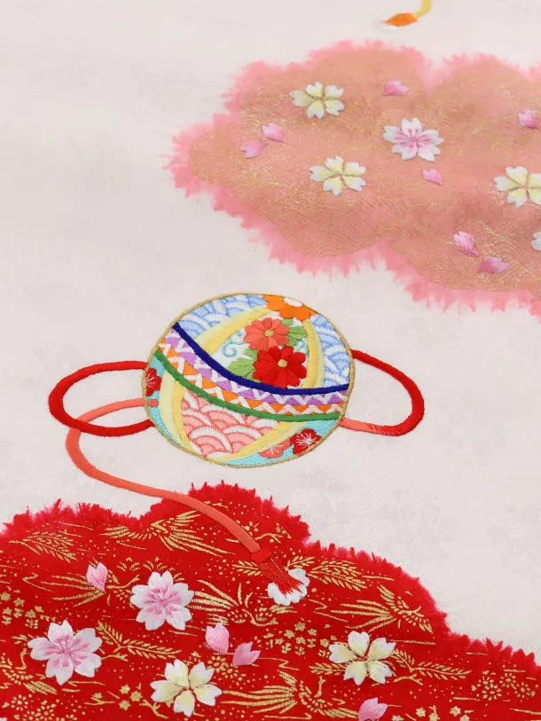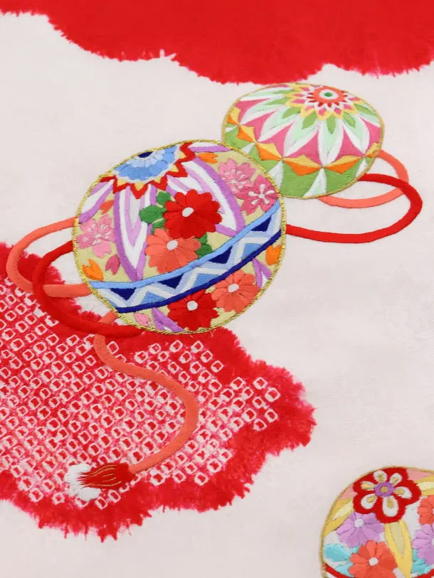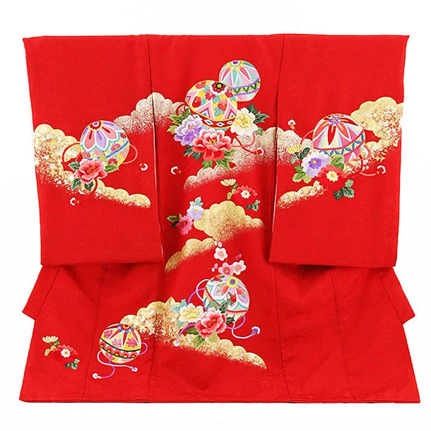 赤地に、鞠(まり)が描かれたお着物です。赤地に絞りで描かれた雲取模様が古典的な印象です。可愛らしい鞠(まり)が上品な可愛らしさをより一層引き立てます。