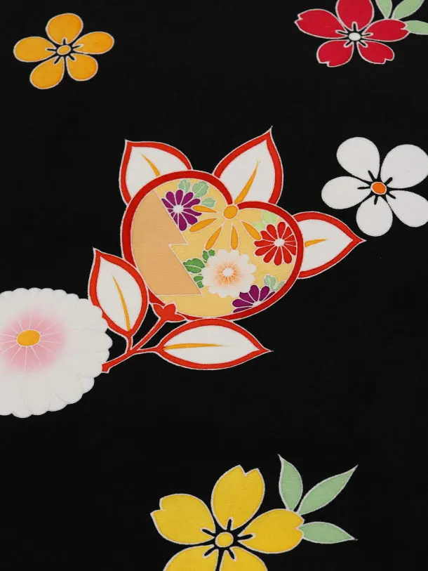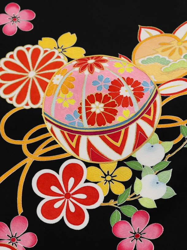黒地に、鞠(まり)と可愛らしい花々が描かれたお着物です。丸みのある鞠(まり)と全体にちりばめられた花柄が可愛らしく上品な雰囲気です。黒地にはっきりとした色使いの柄が華やかな印象も添えます。