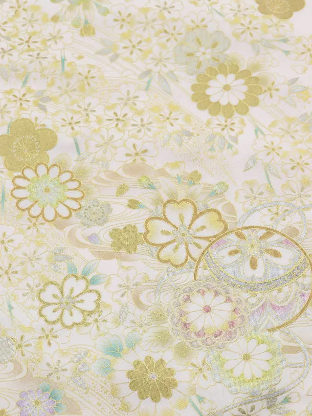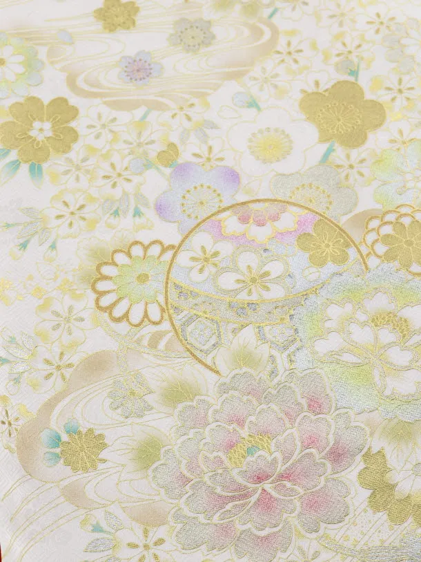 白地に、鞠(まり)と牡丹が描かれたお着物です。金色を使ってふんだんに描かれた鞠と花々が大変豪華な印象です。全体的な淡い色使いが上品な印象を添えます。