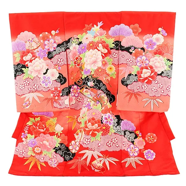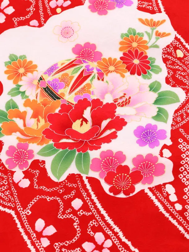 赤地に、熨斗(のし)、鞠(まり)、牡丹などの花々が描かれたお着物です。絞り柄で描かれた熨斗(のし)が個性的な印象です。鮮やかな色使いが華やかな雰囲気を添えます。