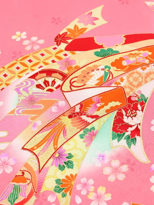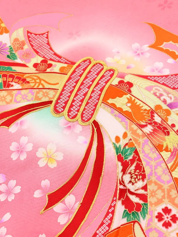 赤地に、熨斗(のし)が描かれたお着物です。中央に描かれた熨斗(のし)と周りに散りばめられた桜が大変豪華な印象です。神社へのお宮参りの晴れ着や記念撮影にオススメです。
