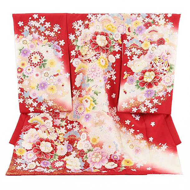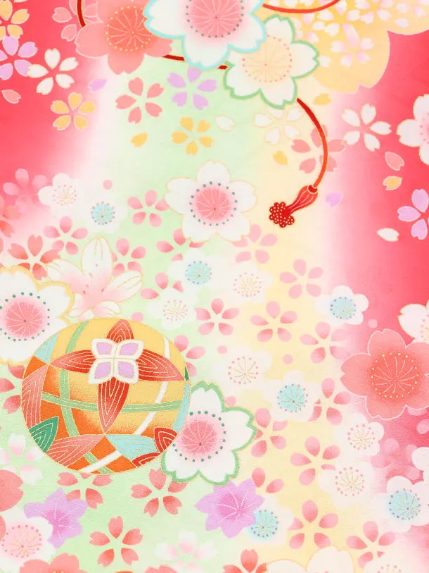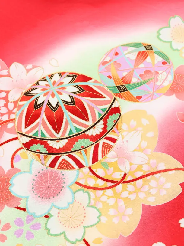 赤地に、鞠(まり)と桜が描かれたお着物です。鞠(まり)のふっくらとした丸みと散りばめられた桜は女の子らしく愛らしいデザインです。明るい色使いと優しい色のぼかしが上品さをより引き立てます。