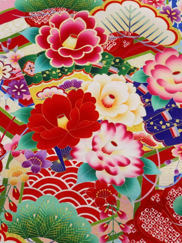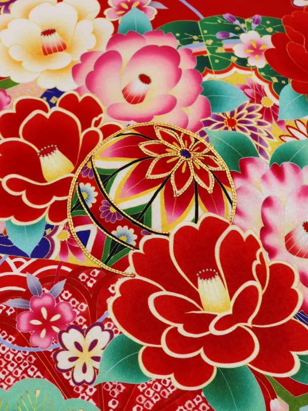 赤地に、古典柄と牡丹が描かれたお着物です。大胆に入った亀甲柄と華やかな牡丹が豪華な雰囲気です。お宮参りや、記念撮影にオススメのお柄です。
